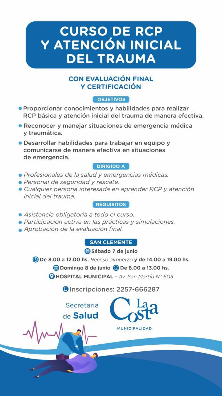 Durante el fin de semana del 7 y 8 de junio, se llevará adelante en San Clemente del Tuyú un curso intensivo de RCP y Atención Inicial del Trauma, una propuesta formativa de alto impacto social que busca fortalecer las capacidades de respuesta inmediata ante situaciones críticas.