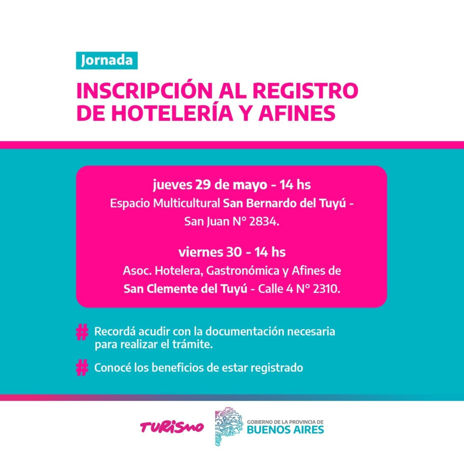 El jueves 29 de mayo de 2025, desde las 14:00, el Espacio Multicultural de San Bernardo del Tuyú (San Juan Nº 2834) fue sede de la Jornada de Inscripción al Registro de Hotelería y Afines, una iniciativa que continúa el viernes 30 a las 14:00 en la Asociación Hotelera, Gastronómica y Afines de San Clemente del Tuyú (Calle 4 Nº 2310). Organizada por la Subsecretaría de Turismo de la Provincia de Buenos Aires junto a la Secretaría de Turismo del Partido de La Costa, la jornada ofrece asesoramiento personalizado a prestadores turísticos para categorizar sus alojamientos.